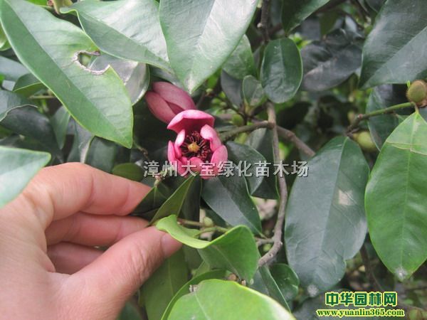 詳細含笑球的別稱:香蕉花、含笑花,拉丁名:Michelia figo。含笑球含笑葉綠花香,樹形、葉形俱美,是重要的園林花木。栽培歷史悠久,宋代詩人鄧潤甫詩句:“自有嫣然態,風前欲笑人。涓涓朝露泣,盎盎夜生春。”形容含笑花具有嫵媚動人的嫣然美態,既有含笑本身嬌羞婀娜的“笑”,又有人對含笑贊賞的笑意,非常有情。即使含笑“泣淚”時也楚楚動人,它清晨含苞泣露,入夜盎然芬芳。寧代楊萬里詩句:“秋來二笑再芬芳,紫笑何如白笑強。只有此花偷不得,無人知處自然香。”。含笑球含笑球,木蘭科植物。別名為香蕉花、含笑花。常綠灌木或小喬木,分枝緊密,組成圓形樹冠。小枝和葉柄上均密被褐色茸毛。葉橢圓形或倒卵狀橢圓形,革質,全緣,嫩綠色。花單生于葉腋間,小而直立,乳黃色或乳白色,花瓣6枚,瓣緣常帶紫暈,肉質,香味濃郁,有香蕉香味。4月~6月開花。9月果熟。
