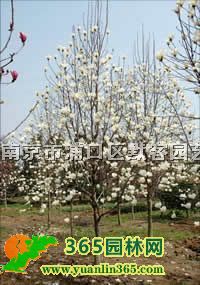落葉喬木,高可達25米,樹冠卵形。小枝淡灰褐色。冬芽大,密生灰綠色或灰綠黃色長絨毛。綠黃色長絨毛。葉互生,寬倒卵形至倒卵形,先端圓寬,具短突尖,中部以下漸狹楔形,全緣。3月先葉開大型花,花頂生直立,鐘狀,白色,有清香。聚合果呈不規則圓柱形,9月果熟。種皮鮮紅色。本屬常見栽培的樹種還有二喬木蘭(M.×soulangeana),為玉蘭與紫玉蘭的雜交種。落葉小喬木,高可達15米。葉倒卵形或寬倒卵形,先端寬圓,下面具柔毛;ㄏ热~開放,花期3月,鐘狀,外面淡紫色,內面白色。萼片三片,似花瓣狀,長度為花瓣之半或近等長,有時綠色。果熟9~10月,果實同玉蘭。